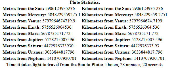 An image of the planetary statistics output in response to a request string specifying ‘Pluto’ as the planet name and ‘html’ as the format.